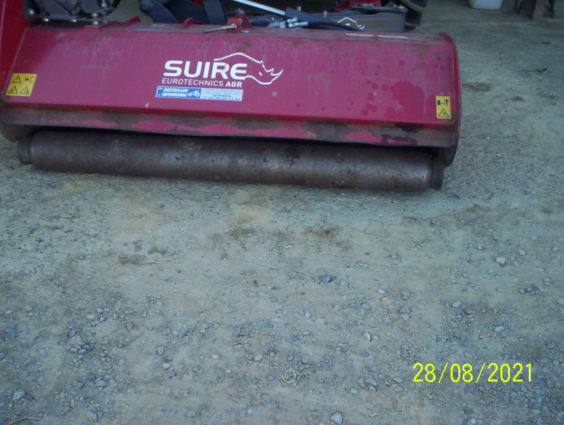 Aujourd'hui, j'ai vu ce modèle français de broyeur à fléaux SUIRE avec pompe hydraulique italienne.Il est déportable et inclinable verticalement et avec rouleau palpeur, comme celui de Criters. Le propriétaire m'a dit qu'il est très bien au travail et de bonne conception. Il a un John Deere 1130 de 51 ch din pour le tracter.A remarquer les 2 vannes sur le circuit hydraulique et la cheville sur le bâti qui sinon se place au niveau de l'attelage.
