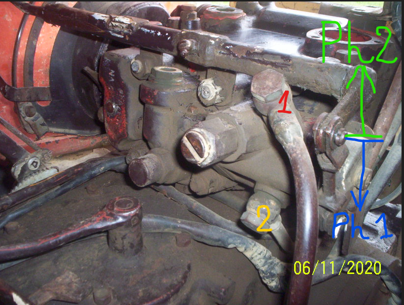 Phase 1:je pousse sur le levier vers le bas, l'huile sort par 1 du distri( là où j'ai mis la "cheminée" 576233 du double effet) , alimente 1 du vérin, le piston avance, la tige du vérin sort, les versoirs sont horizontaux, l'huile est revenue au distri par 2.