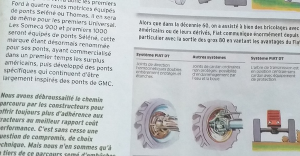 L'Universal 600 DT n'est en effet pas la copie du Someca 600 TD. La transmission du pont avant est déportée et les réducteurs plus petits et pas les mêmes que le Someca. Un filtre a gas-oil sur le démarreur et les équipements électriques différents surement. Dans mes archives, j'ai retrouvé un dépliant sur tous les 600 UTB d'où cette photo: