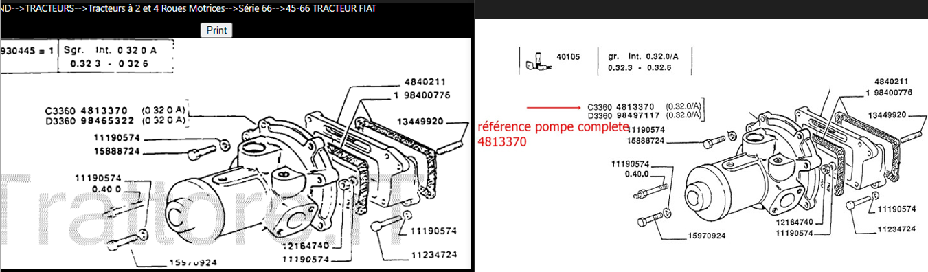 Quelqu'un aurait il la référence de cette pompe à eau ainsi que tous les joints pour fiat 45-66 moteur fiat 8035.06 ?
