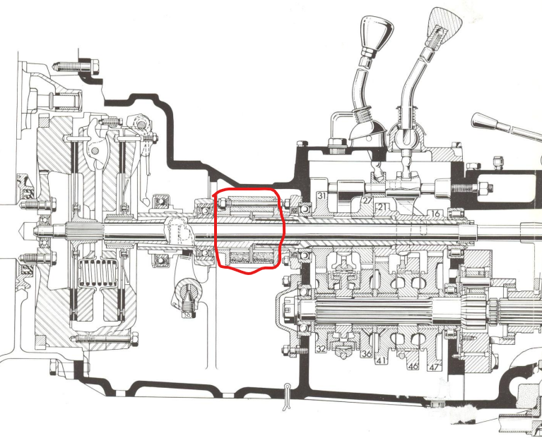 Vue de tout l'ensemble,du système d'enclenchement de la pdf. Egalement l'accouplement élastique à l'avant: peut-être qu'il est usé: