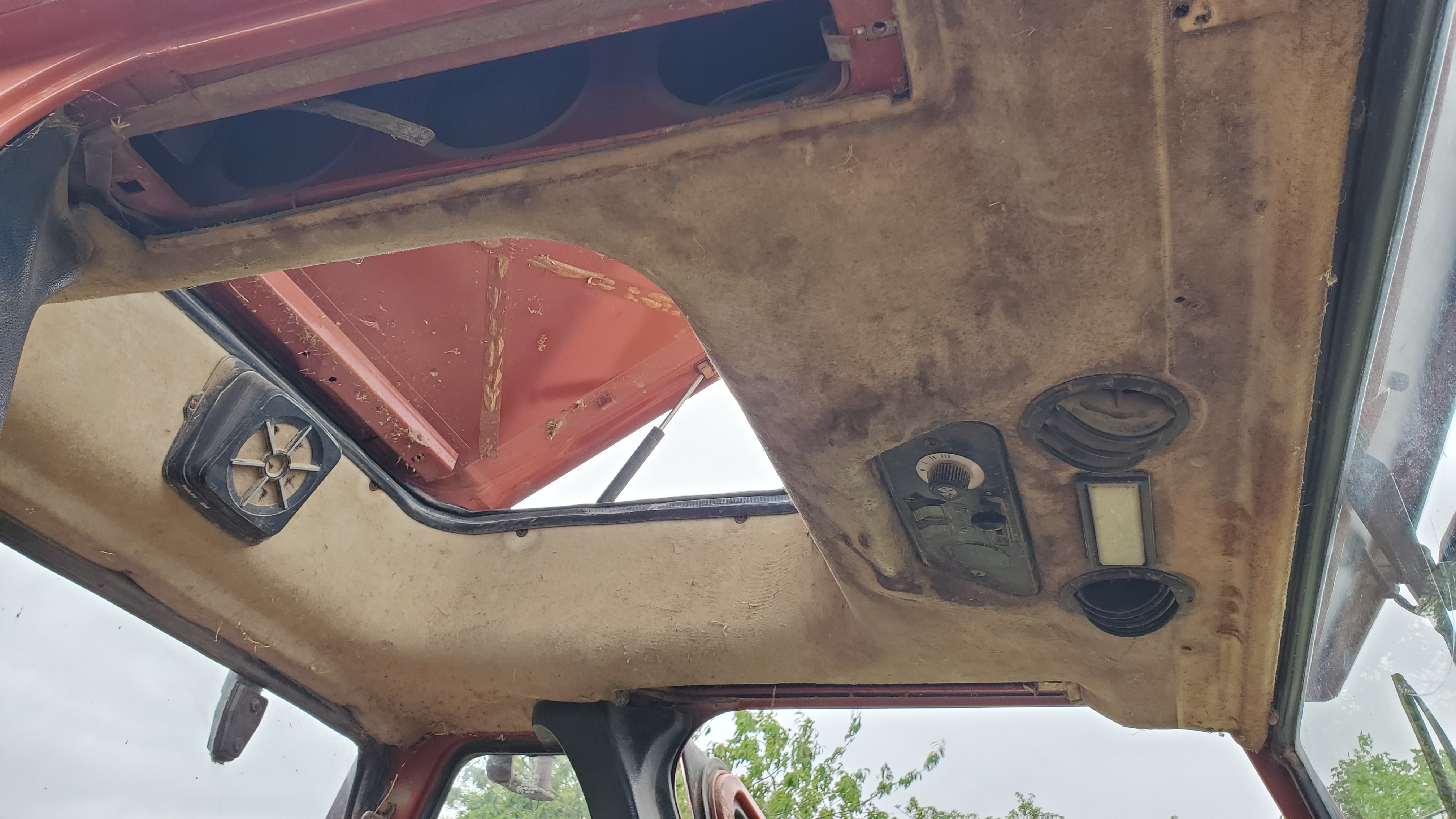 Je viens de déposer la garniture de toit pour nettoyer un peu. Même sans poussière c'est crade, j'ai quand même envie de refaire ça plus propre, j'hésite entre recouvrir d'un tissu ou voir si ça peint :-/ (ou une sorte de teinture plutôt, mais ce serait forcément sombre).