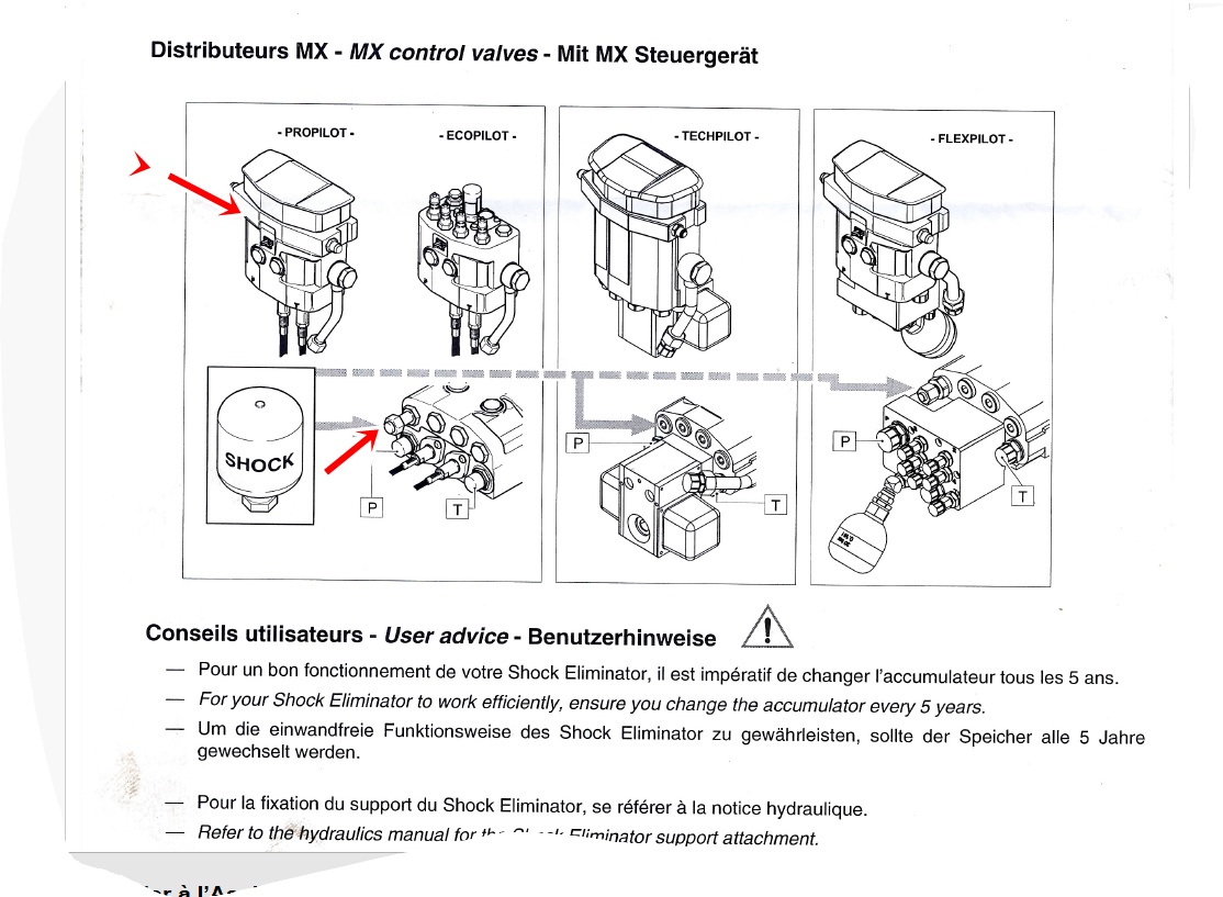 donc il faut branché un flexible de ( P ) du distributeur du chargeur qui va vers la sortie du distributeur de frein de remorque ( c'est l'alimentation d'huile )