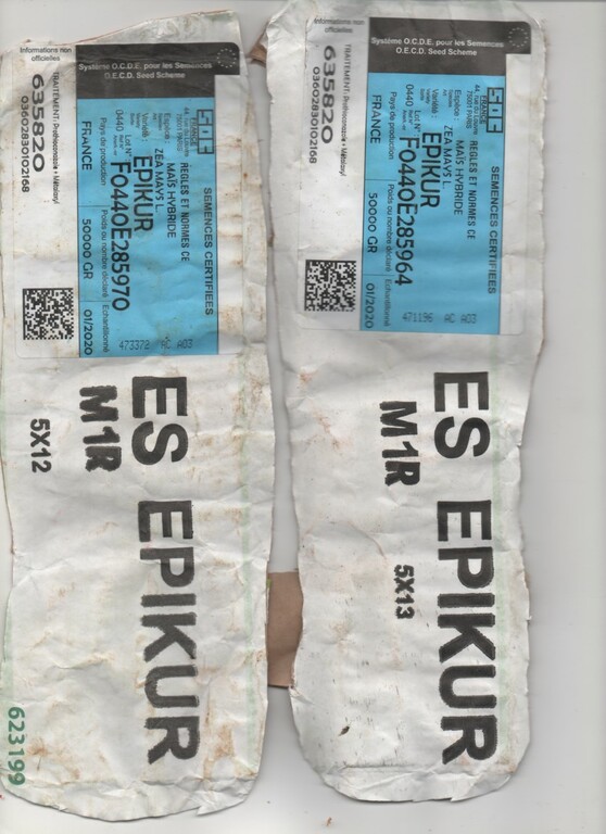 Pour le maïs normalement je le sème début mai avec le semoir LATISNERE que j'ai montré.Il n'y a pas de soufflerie, c'est les roues qui entraînent et il me faut la semence qualibrée ( plateau 5x13(accepte aussi 5x12)comme c'est marqué sur le sac).