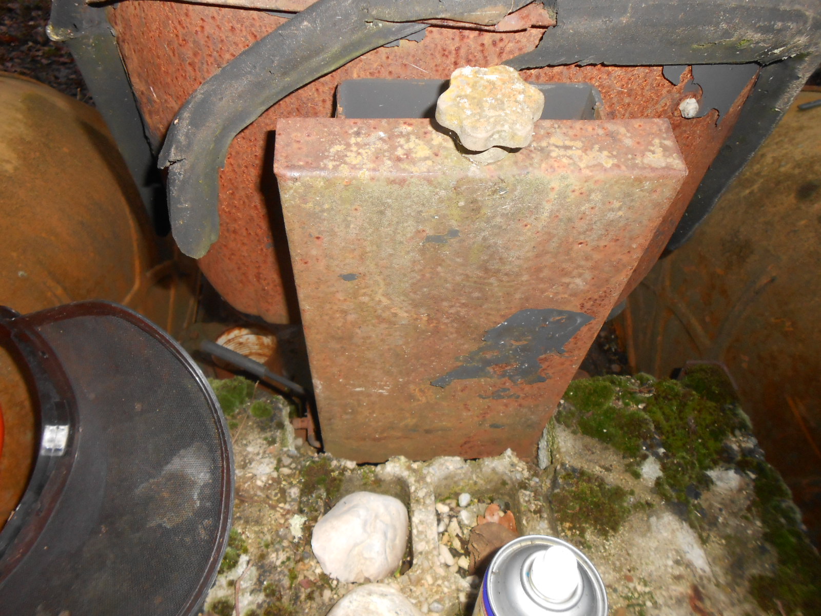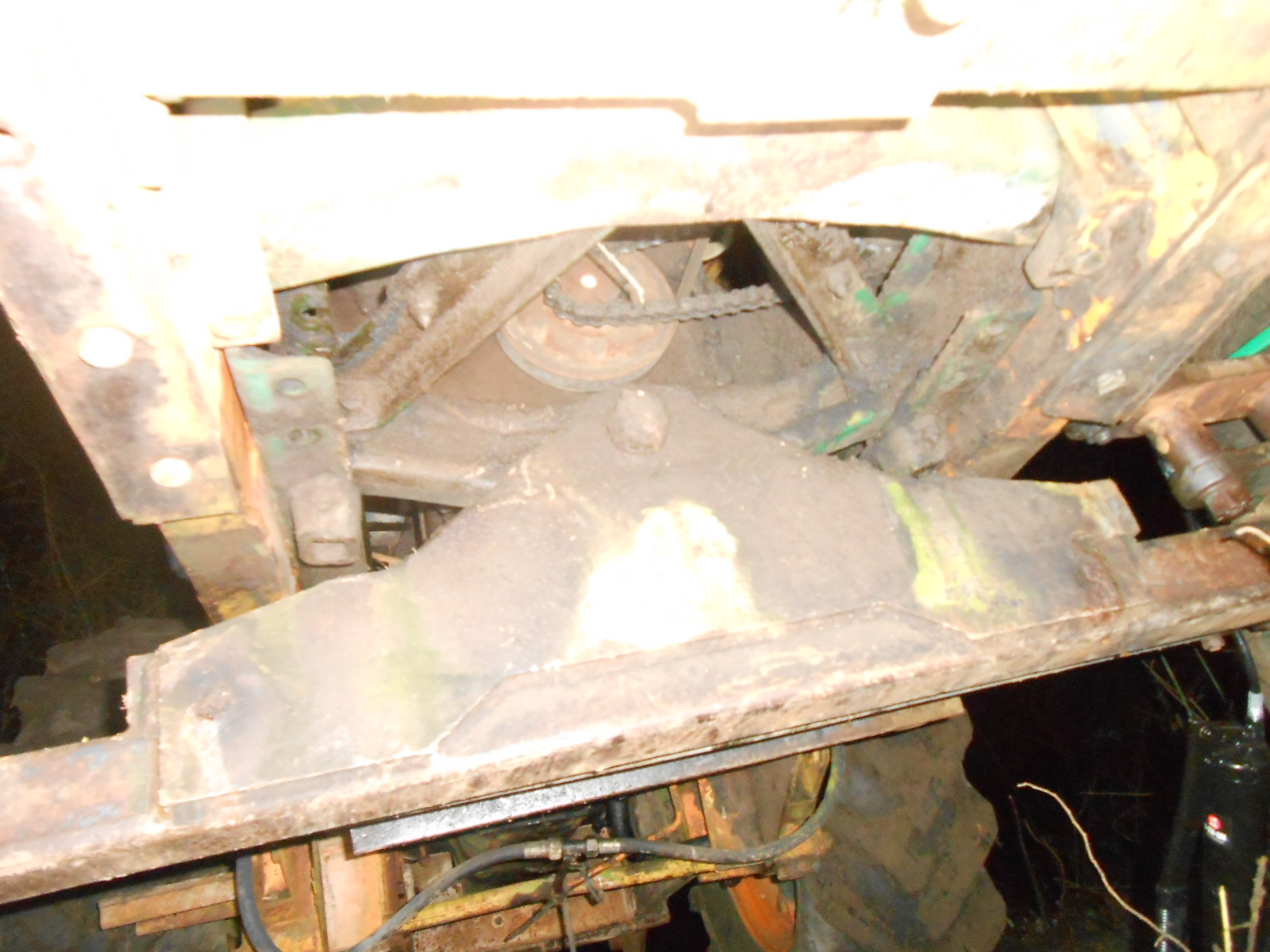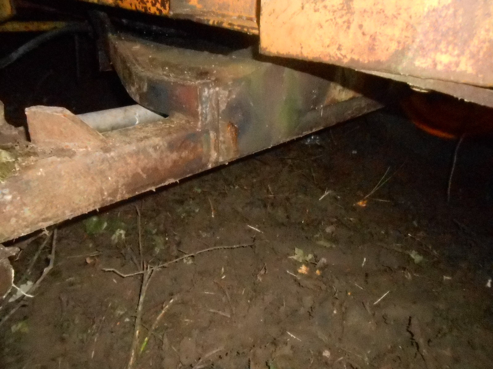 Et quelques photos de dessous, et derrière les moellons entre les trous pour essayer d'apercevoir la PTO, mais rien, même si il semble avoir un bloc d'huile (les têtes de boulons).