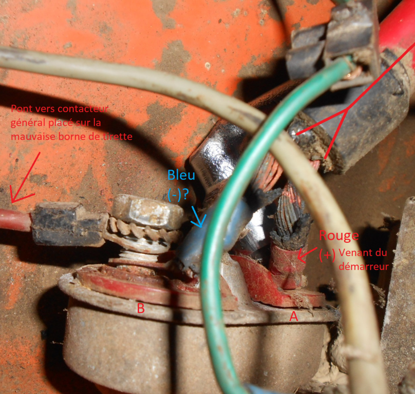 Laquelle (Borne B) prolonge le + du démarreur vers contacteur général, via le fil de "pont"' (Ça, c'est le mauvais montage, mais celui qui était présent).