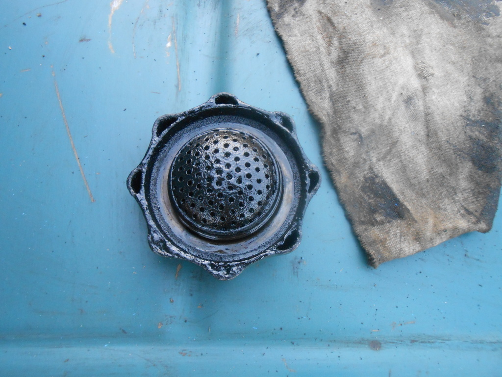 Ca c'est le lendemain, après encore un nettoyage. Le bouchon de reniflard que j'ai pris pour le nettoyer au passage ! Et là, c'est quand j'avais démonter les 3 vis de cache-culbuteur, mais que rien ne bougeait ! Je comprenais pas ! Bon j'ai tapoté, puis tapé au maillet et ça s'est débloqué.