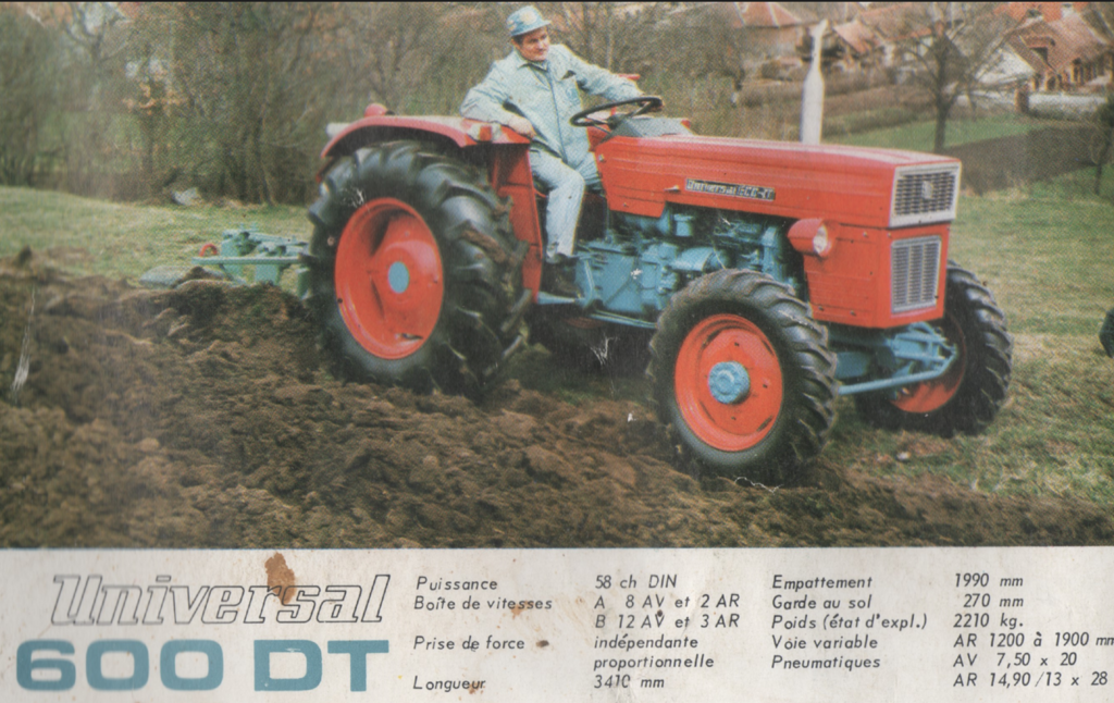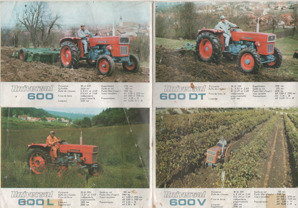 L'Universal 600 DT n'est en effet pas la copie du Someca 600 TD. La transmission du pont avant est déportée et les réducteurs plus petits et pas les mêmes que le Someca. Un filtre a gas-oil sur le démarreur et les équipements électriques différents surement. Dans mes archives, j'ai retrouvé un dépliant sur tous les 600 UTB d'où cette photo: