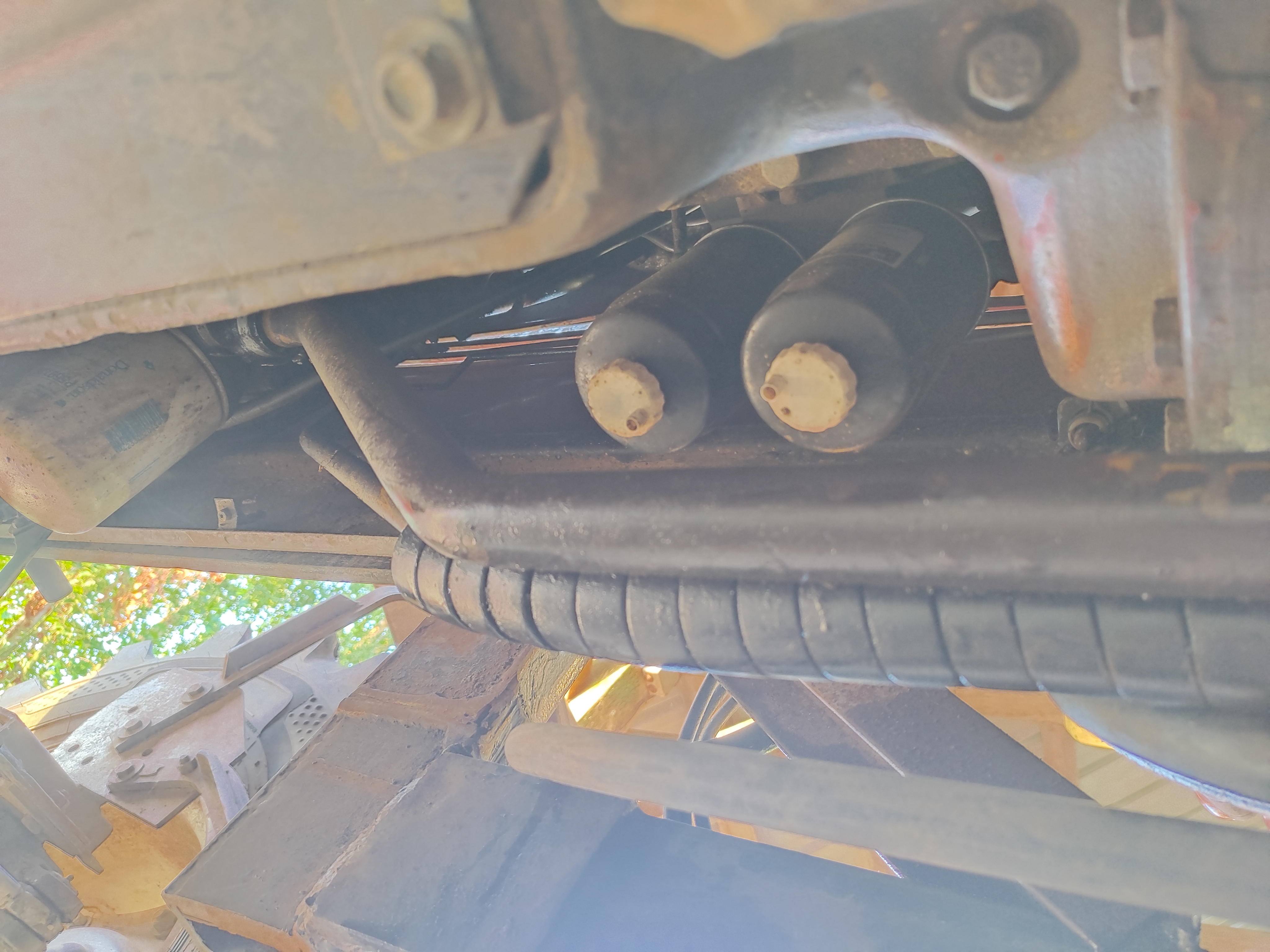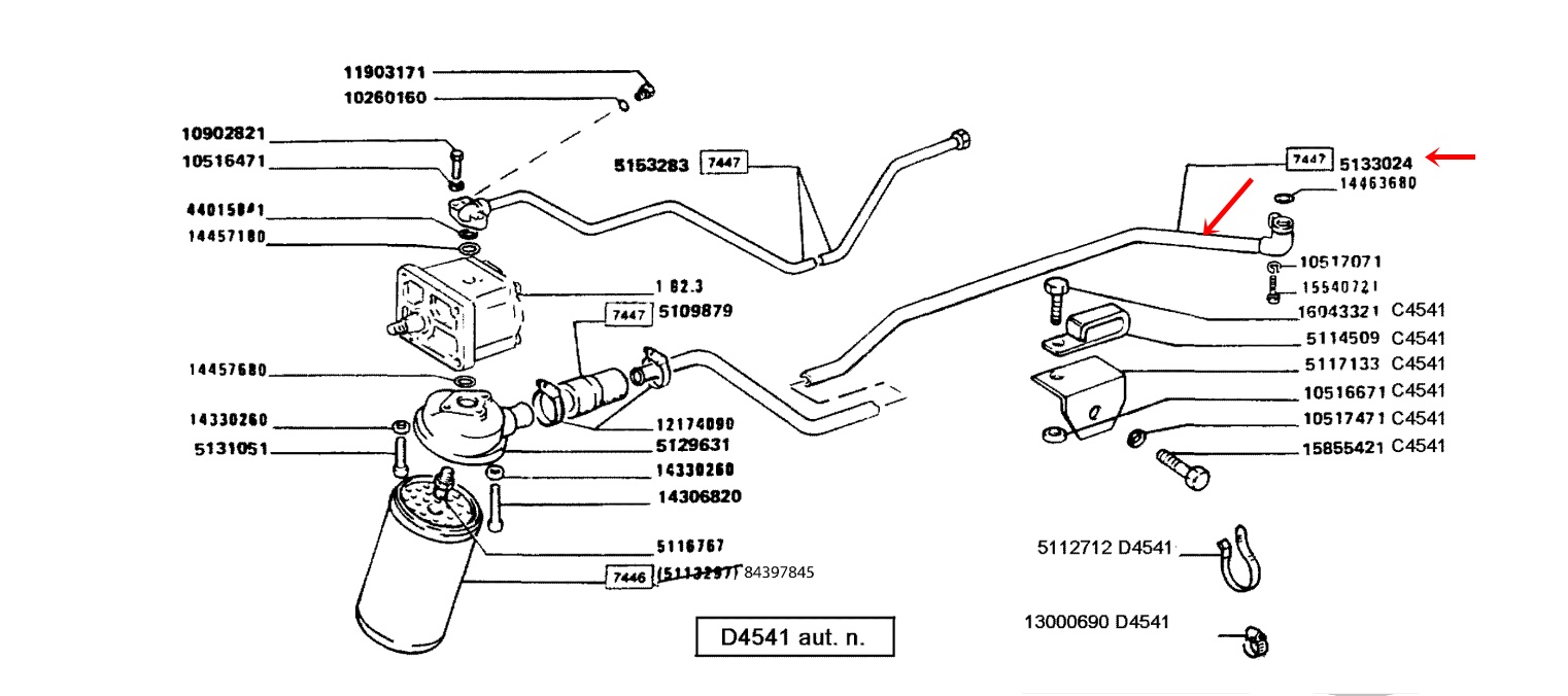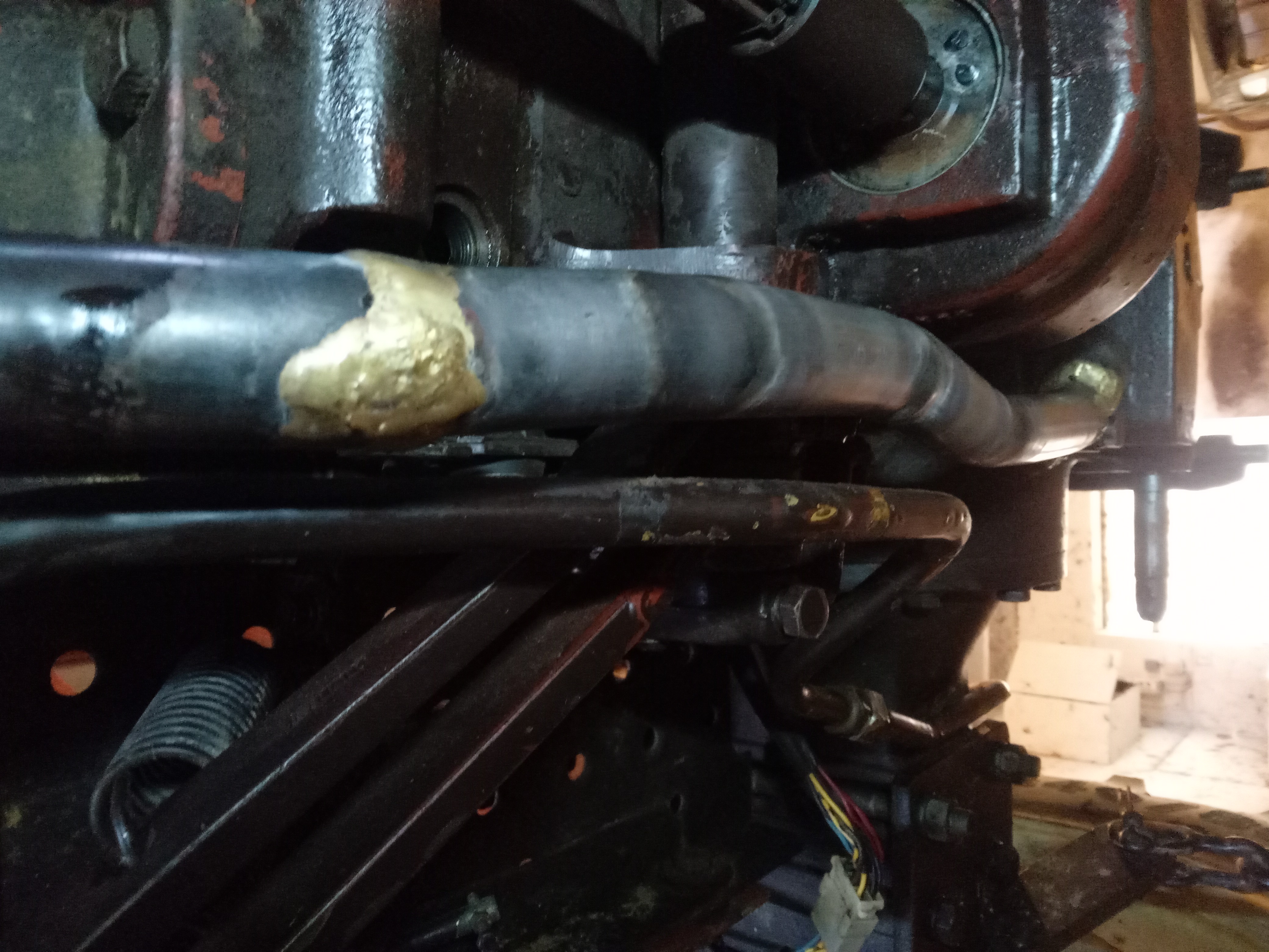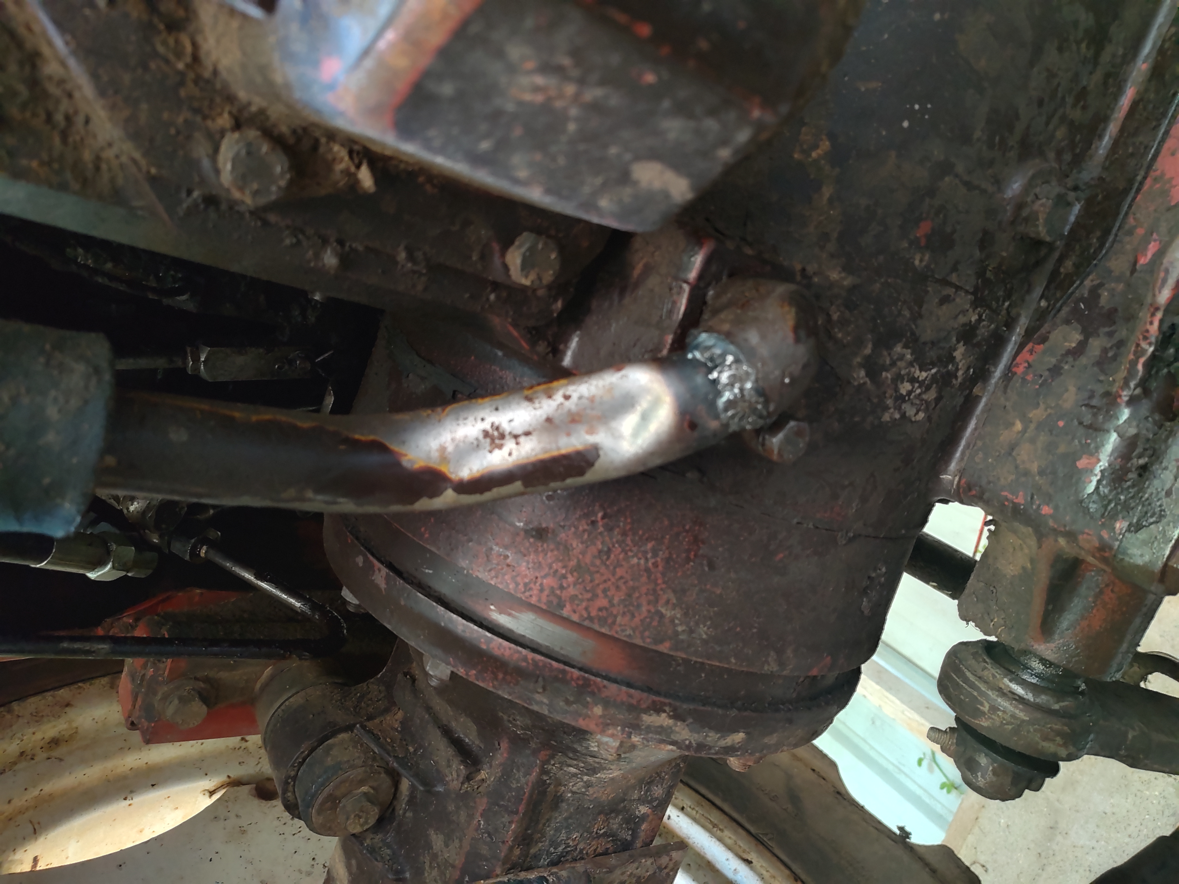 Le gros tuyau rigide hydraulique du dessous, qui relie la pompe au réservoir hydraulique+ boîte de vitesse fuit sévèrement