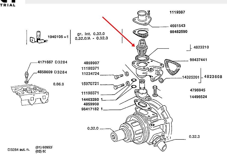 le calorstat se trouve juste au dessus de la pompe a eau , une fois que la vidange de refroidissement est effectué il suffit de défaire la durite supérieur et les 3 vis clé de 13 et ouvrir la boite du calorstat et sortir ce lui ci référence 4823210