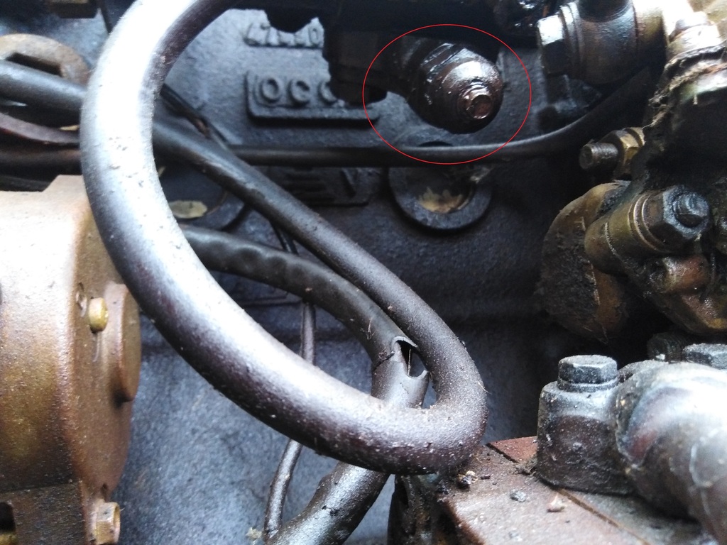 La batterie était déchargée donc j'ai pas pu le démarrer. Ceci dit, en action la pompe à la main, j'ai vu que ça fuyait à priori par l'espèce de boursouflure qu'il y a sous la Pompe à Injection... J'ai cherché sur le web mais j'ai pas su ce que c'était, si c'était rajouté à la PI, si il y avait un joint, ...