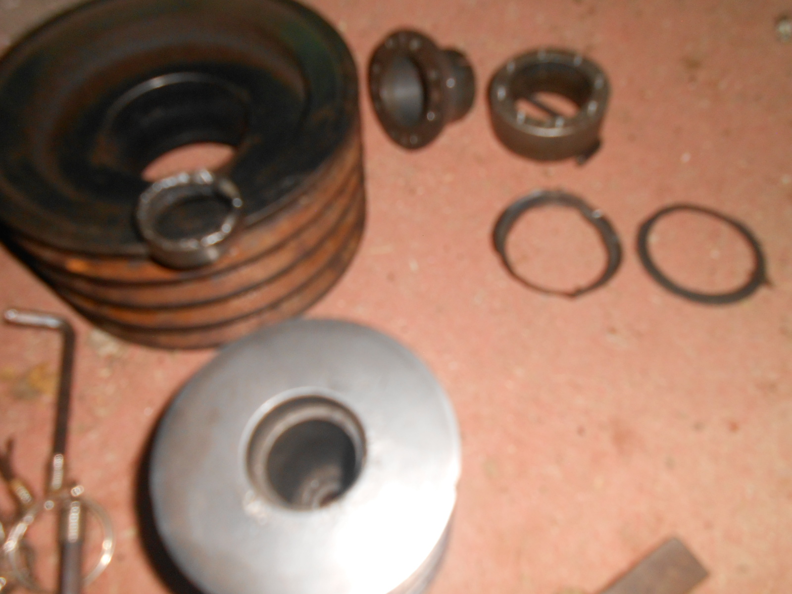 La poulie enlevée, avec le moyeu et les 4 vis de poussées (AqMP) : Le tout démonté en galérant un peu aussi (AqMP) : ET ENFIN, la bonne nouvelle, le palier est présent, il est simplement pas fixé... et apparemment, il aurait perdu ses joints d'étanchéités... (les deux sortes de rondelles retrouvées, entre la poulie et le palier/rotor.