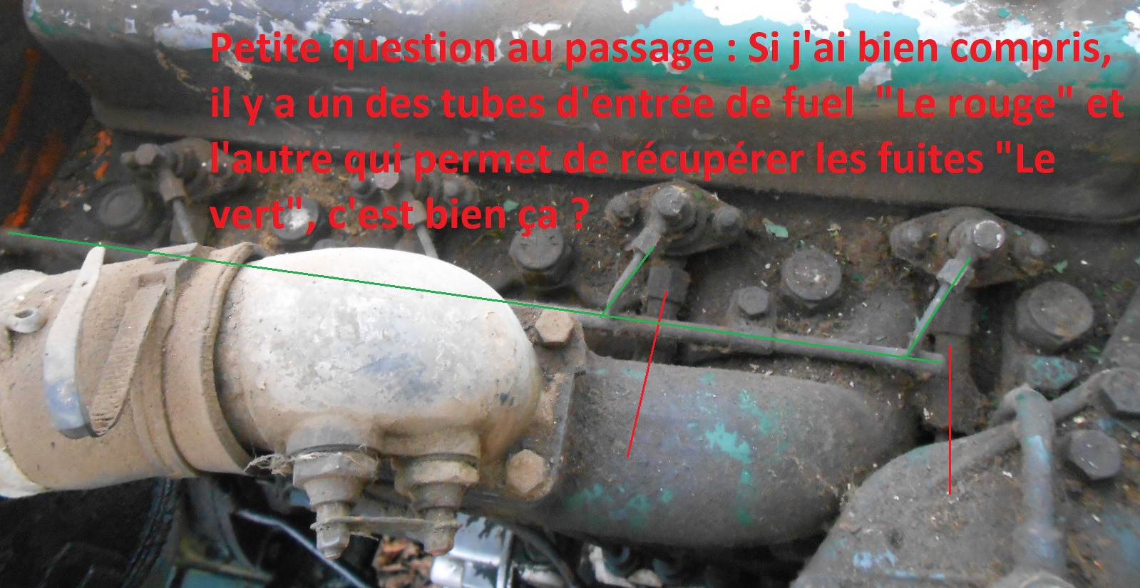 Car au début, je pensais que le Fuel rentrait par le haut, la petite durite en laiton "Le vert", et que la barre/collecteur qui regroupait les 4 durites, servait de réserve de Fuel pour les injecteurs...