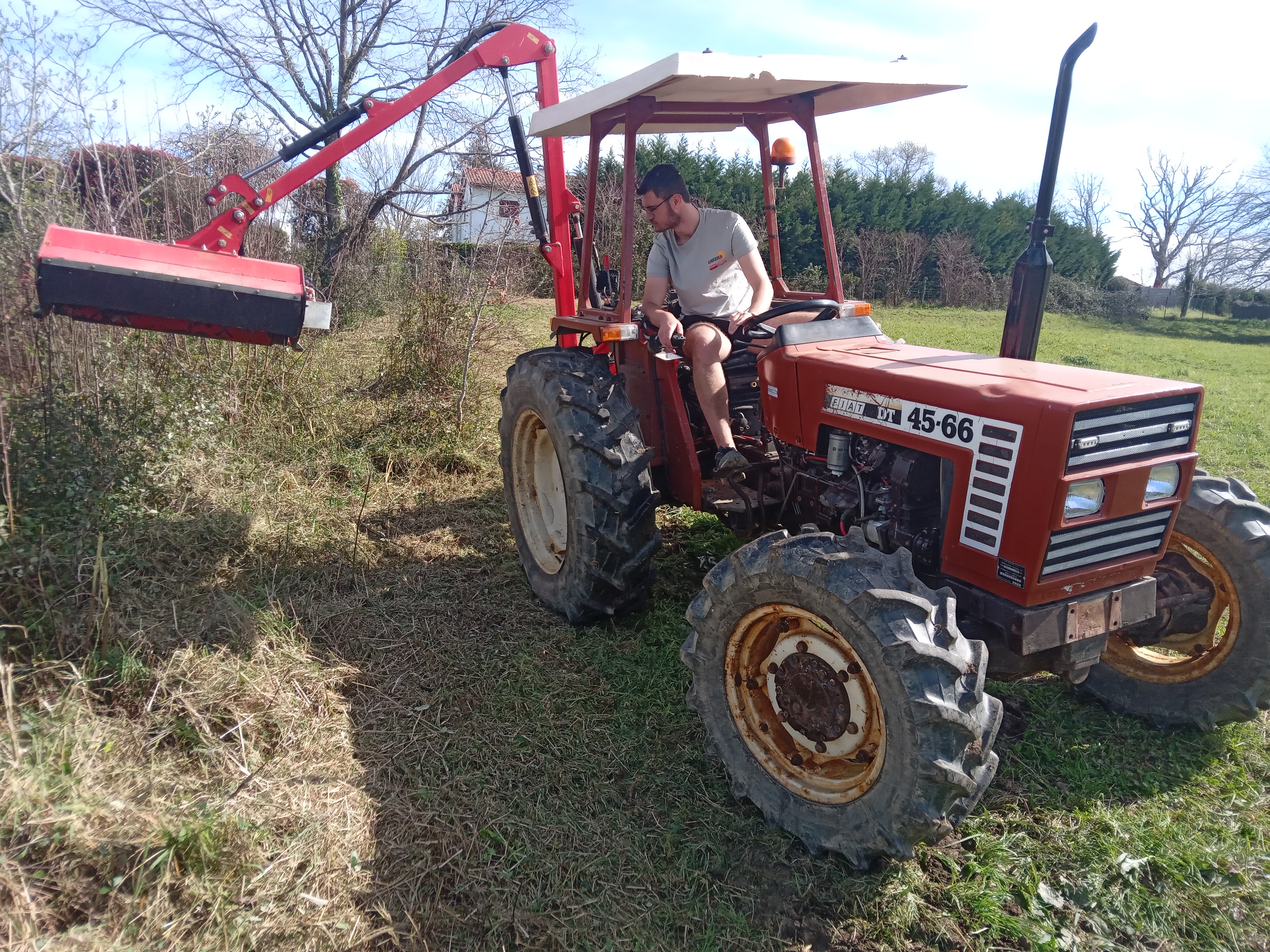 Au bois avec fendeuse équipée d' un treuil électrique.