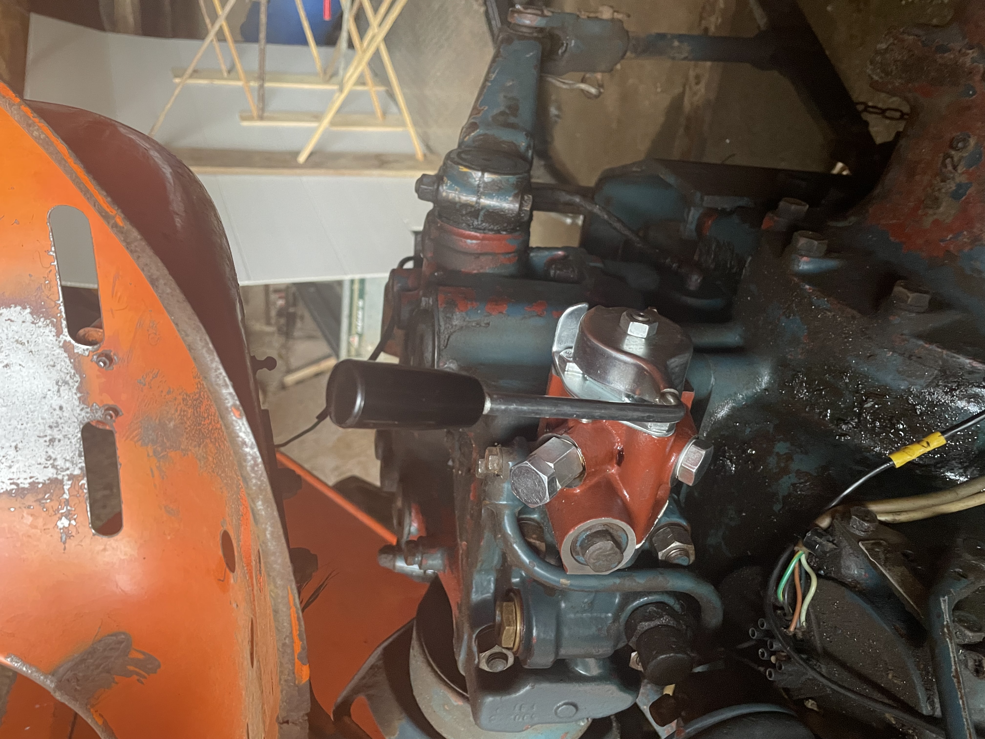 un simple flexible a l'endroit entouré en bleu pour envoyé le va et viens de l'huile vers le vérin simple effet
