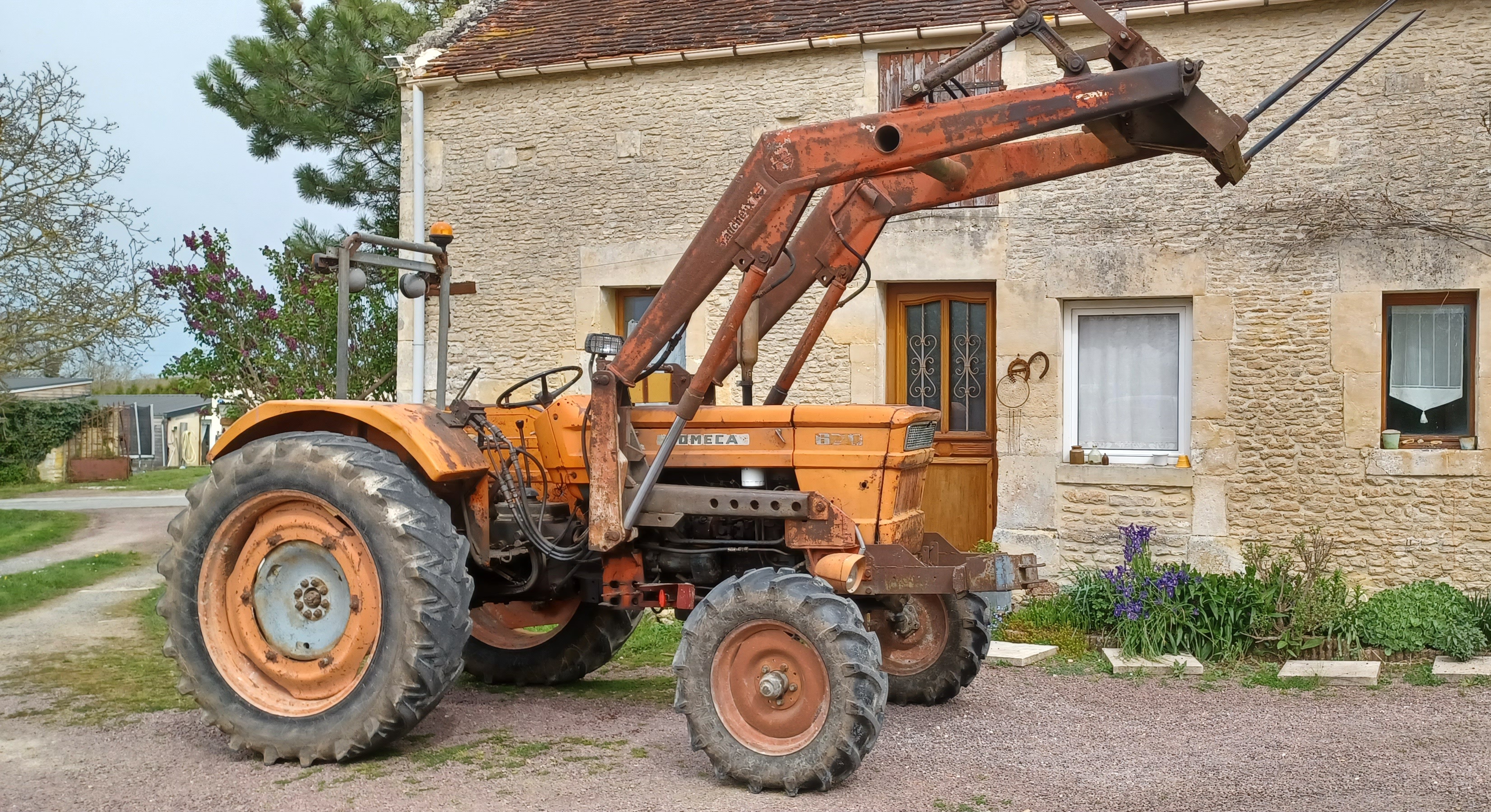 Donc sans direction assistée, ni freinage hydraulique. Les roues avant sont crantées, mais pas motrices : une erreur à la commande dixit le précédent propriétaire. Auparavant j'utilisai un tracteur orange aussi, mais de chez Renault (un 7050 - Super 6 ou 7 ). Mais je voulais un peu plus de puissance ; et j'ai aussi un petit rouge un MF 821D mais lui, je ne le fais pas trop bosser.