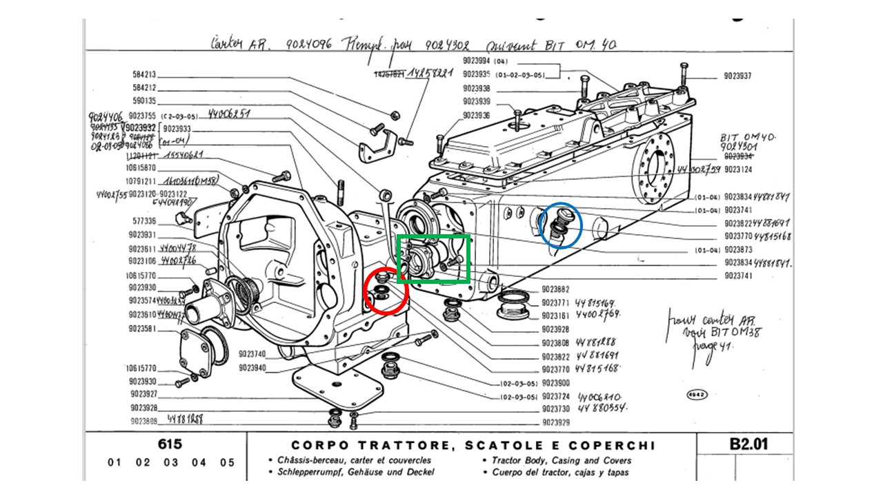 Si l'huile passe d'un carter à l'autre ça serait par ce que la doc des pièces appelle un "corps" entouré en vert (9023882 : corpo, body, corps), mais quel axe supporte-t-il ? : un de la boite de vitesse ? un qui pourrait venir de l'amplicouple si il y en avait un ?