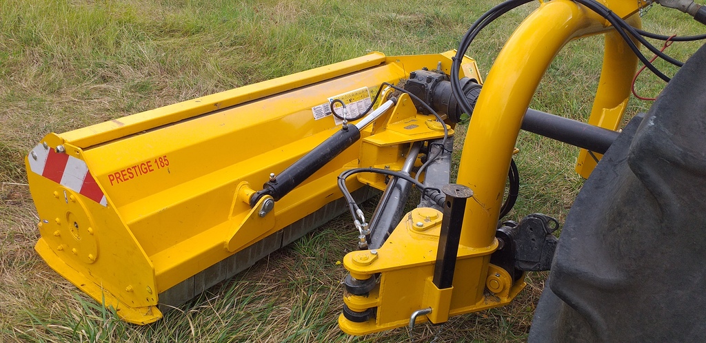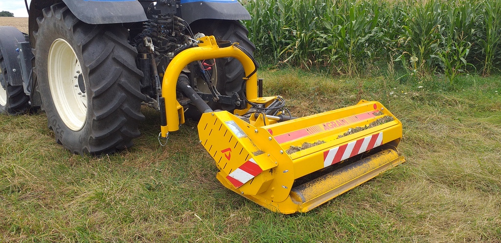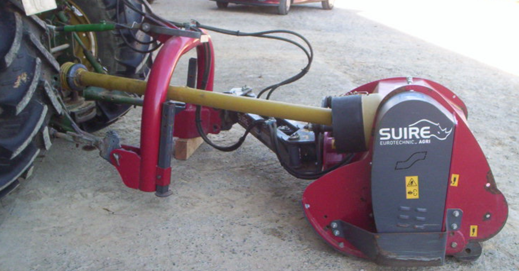 Aujourd'hui, j'ai vu ce modèle français de broyeur à fléaux SUIRE avec pompe hydraulique italienne.Il est déportable et inclinable verticalement et avec rouleau palpeur, comme celui de Criters. Le propriétaire m'a dit qu'il est très bien au travail et de bonne conception. Il a un John Deere 1130 de 51 ch din pour le tracter.A remarquer les 2 vannes sur le circuit hydraulique et la cheville sur le bâti qui sinon se place au niveau de l'attelage.