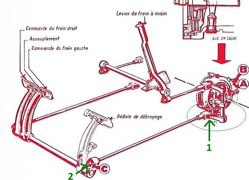Car j'ai l'impression que cette patte (placé à l'arrière vers les réducteurs)... via une tirette métallique liée au pédale de frein, avance direction conducteur quand on appuie sur les pédales, ce qui actionne les freins.