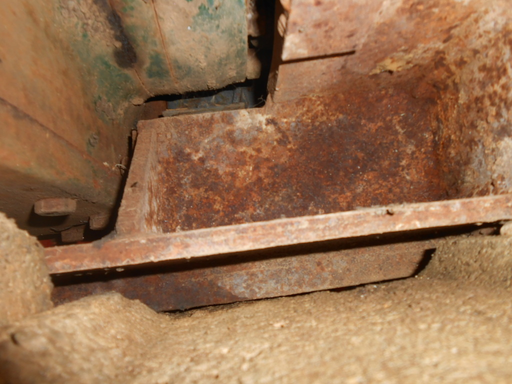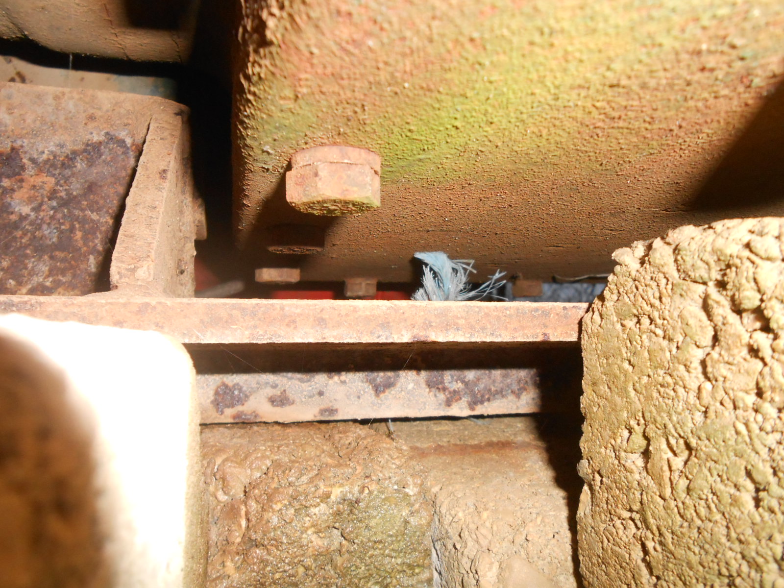 Et quelques photos de dessous, et derrière les moellons entre les trous pour essayer d'apercevoir la PTO, mais rien, même si il semble avoir un bloc d'huile (les têtes de boulons).