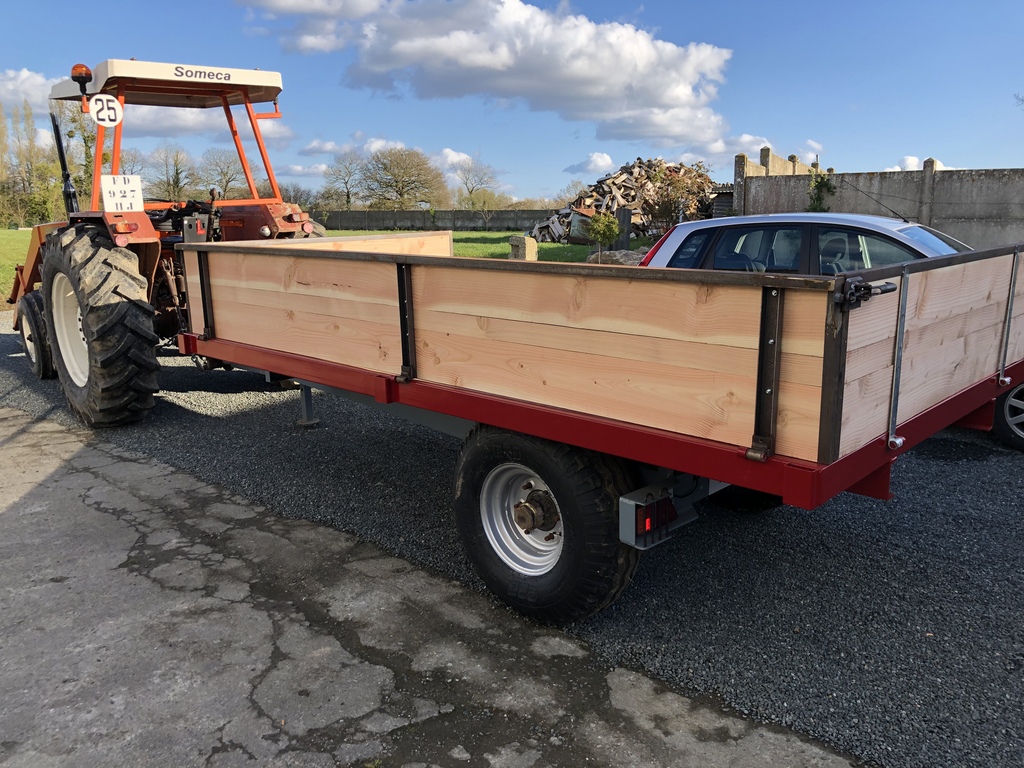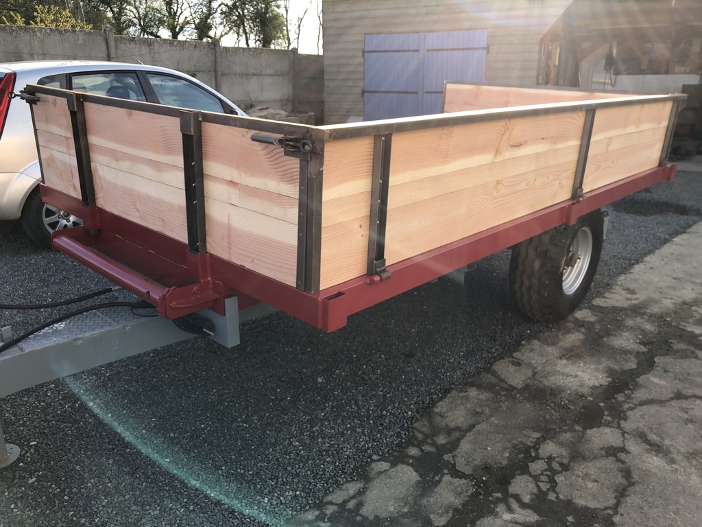 Chez moi on a la même elle était marqué Massey Fergusson ???, le timon n'est pas pareil c'est deux pièces embouties et soudées une à l'autre au milieu, en attendant très pratique, le défaut c'est le plancher et les ridelles qui s'étaient pliées au milieux, je lui ai refait le plancher en tôle et les ridelles je les ai coupées par le milieu et j'ai mis un rancher pour les accrocher.