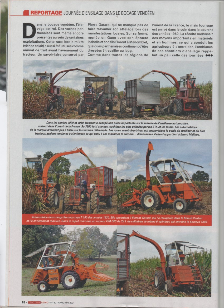 Bonjour, aujourd'hui dans " TRACTEUR RETRO" n°80, reportage : Journée d'ensilage dans le bocage vendéen et présentation de la seule ensileuse automotrice de SOMECA: la TA 150