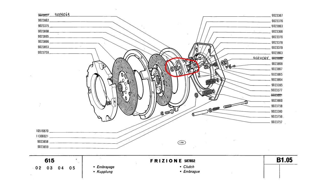 Déjà je trouve que c'est à la doc du 615 qu'il ressemble le plus, et surtout je vois une qu'il y a un jeu qui me parait important au niveau de la vis avec écrou/contre écrou que j'ai entouré en bleu sur ma photo, et en rouge sur le schéma. Lorsque je débraye, le jeu se réduit, et ça semble décoller les disques. Si je resserre, écrou et contre écrou, j'ai l'impression que ça décollera plus, mais il y a sûrement une juste mesure ?