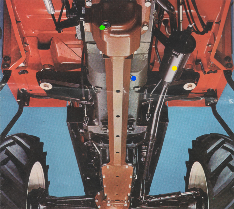 Pardon , j'ai oubliez que tu as un DT: donc tu as un bouchon de vidange du boîtier du pont avant en plus - le vert ( 3 au total) donc il te faut plus d'huile multifonctionnelle. La vidange bv en bleu et le filtre en jaune:
