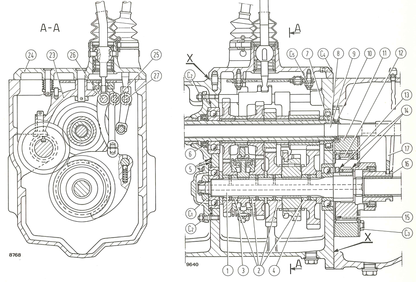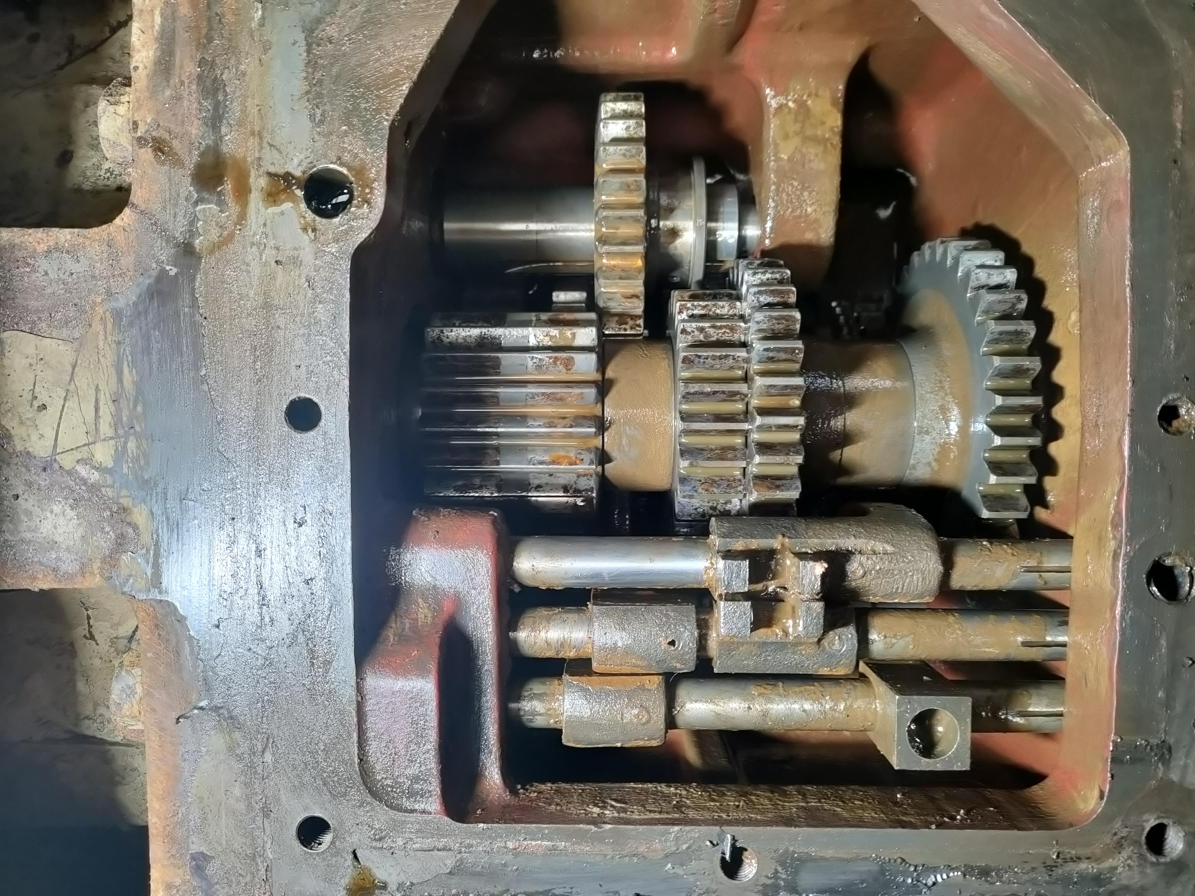 Le pignon d'en haut(marche arrière ) doit s'enclencher et s'enlever: voir l'état des dents sur tout le pourtour des 2 pignons en contact et la présence d'huile. C'est la fourchette 23 que tu as sur le couvercle qui fait le coulissement. Là tu fais avec une pièce métallique( pied de biche, démonte pneu ou autre)